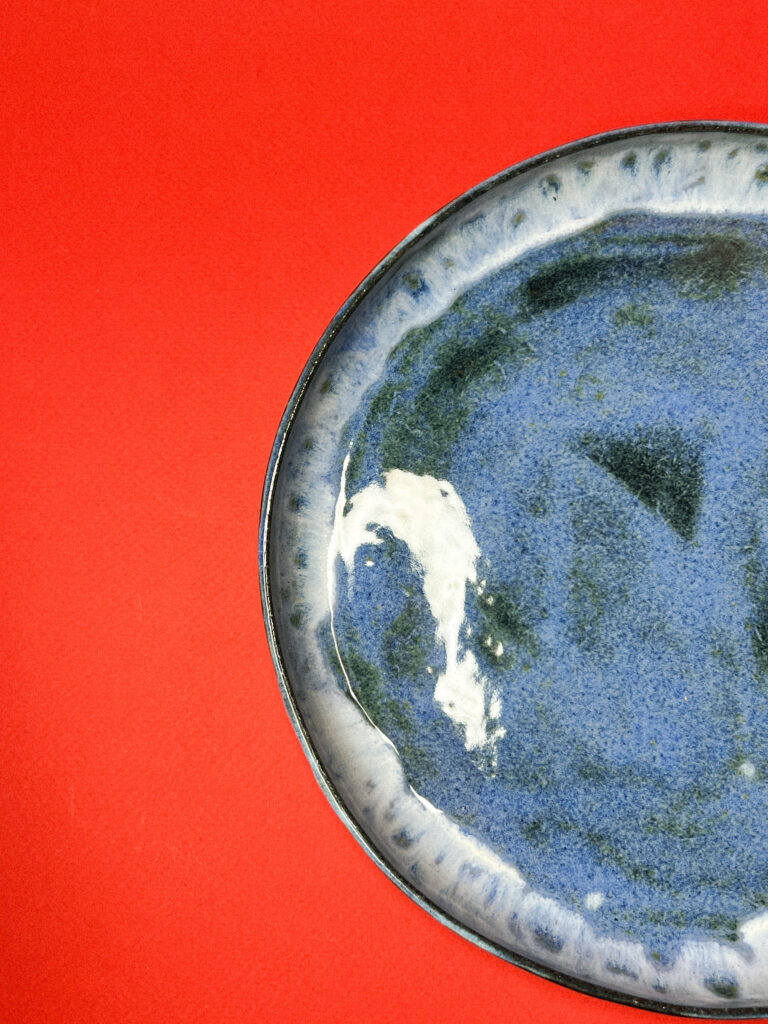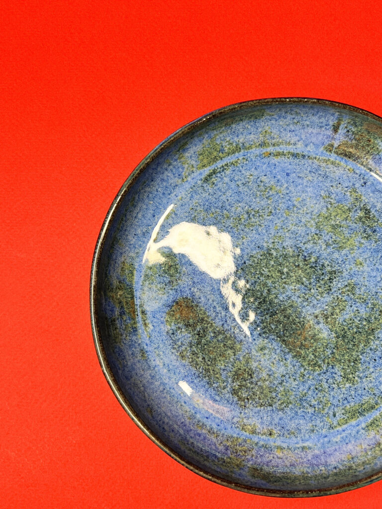 Голубая керамическая тарелка с оттисками трав и цветов «Песнь далей», РФ