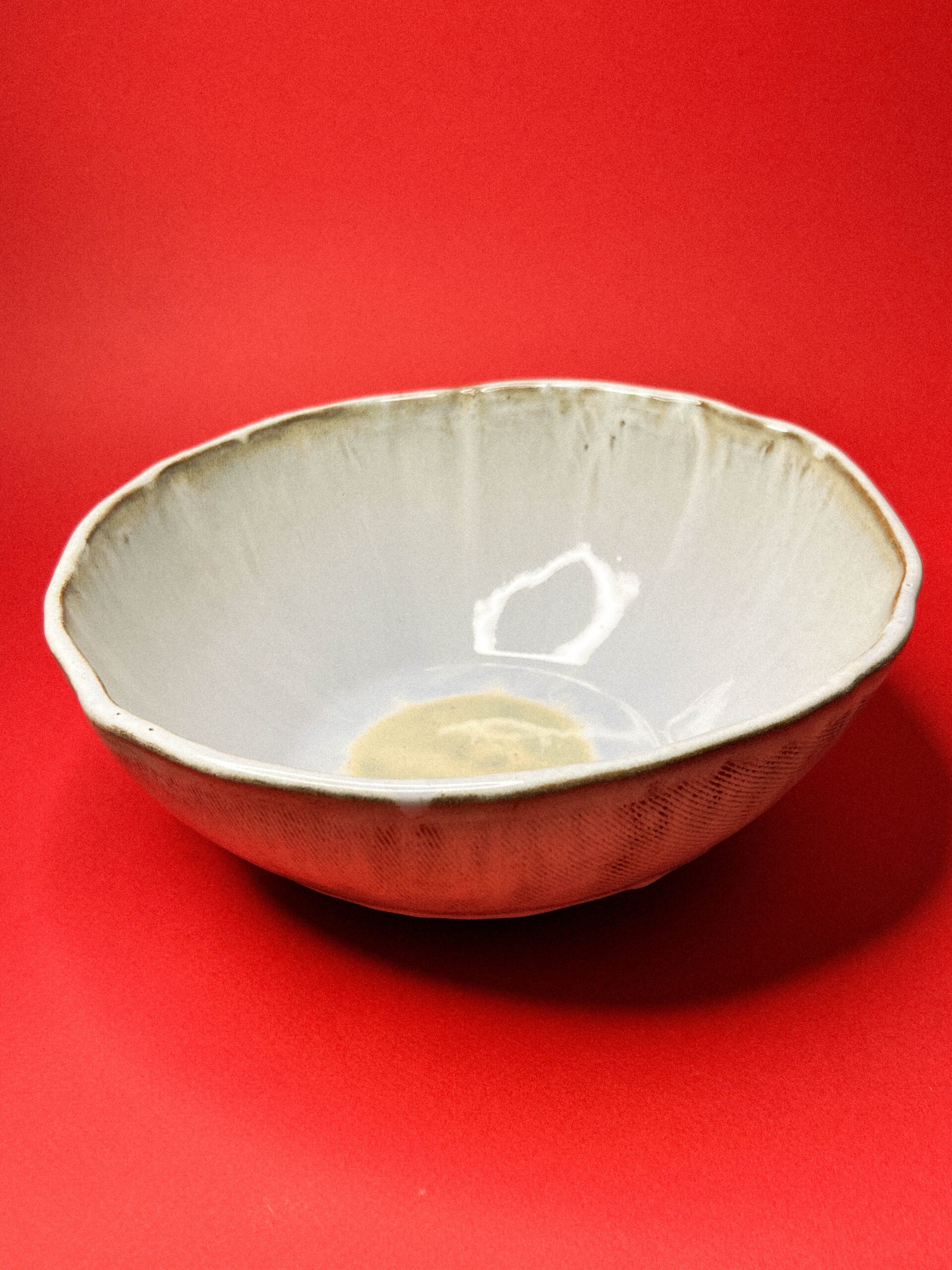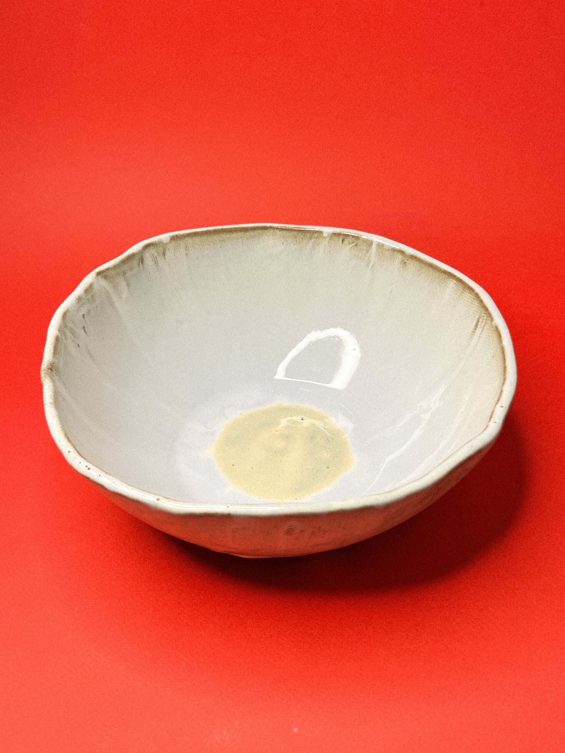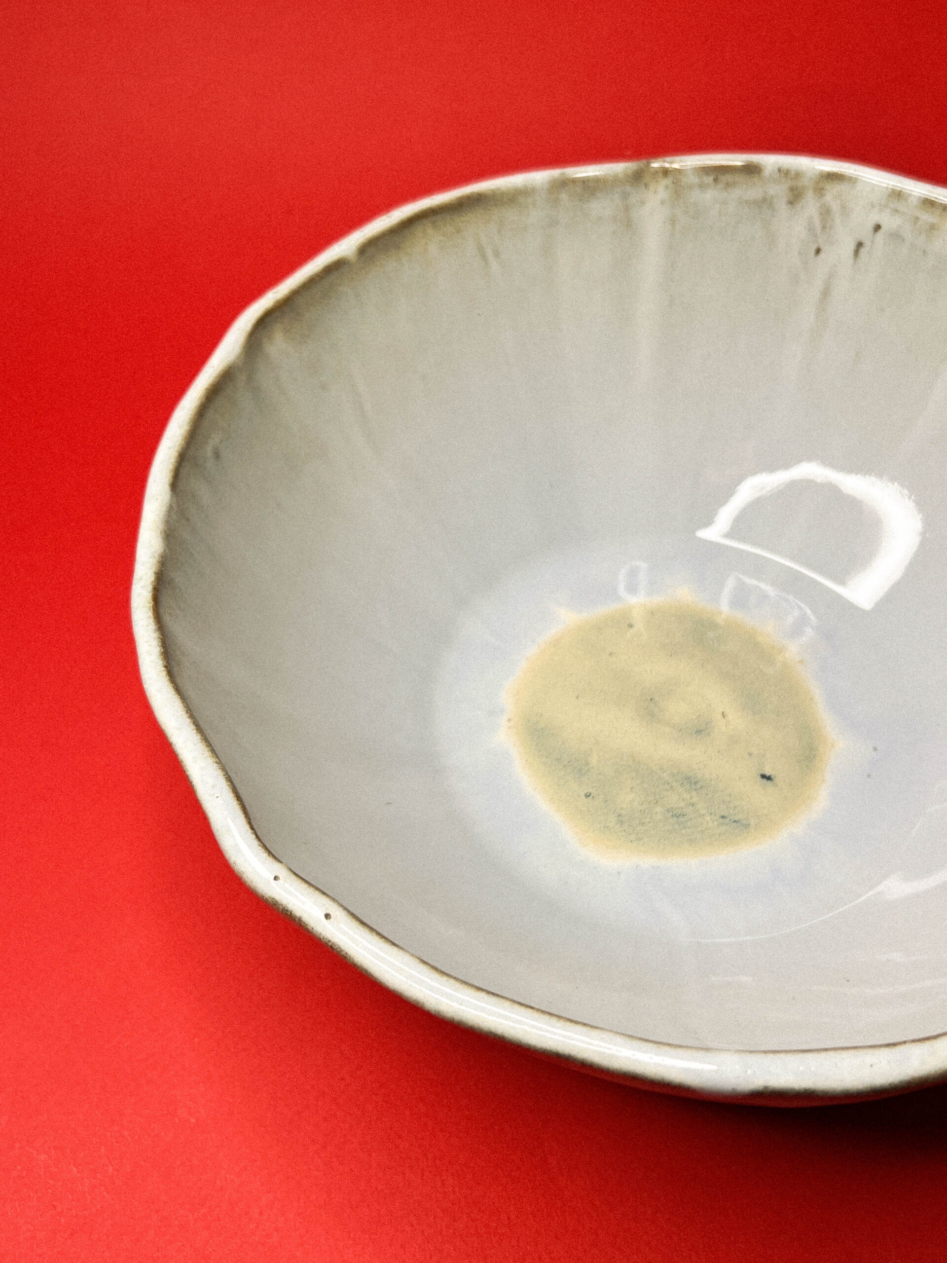 Эта миска словно утро после долгой ночи. Светлая, едва голубоватая глазурь с мягким тёплым центром напоминает о первых лучах солнца, которые разгоняют мрак. Нерегулярный край будто хранит память о ветре, дувшем над спокойной водой.