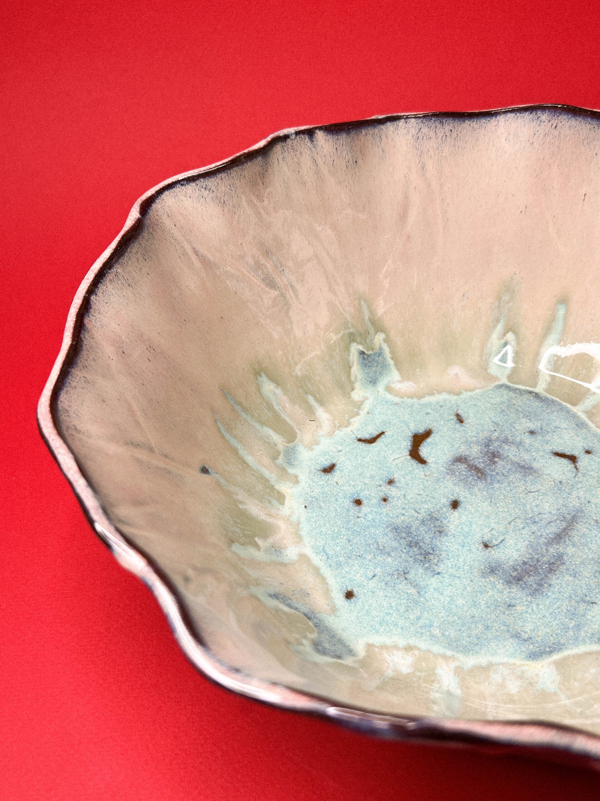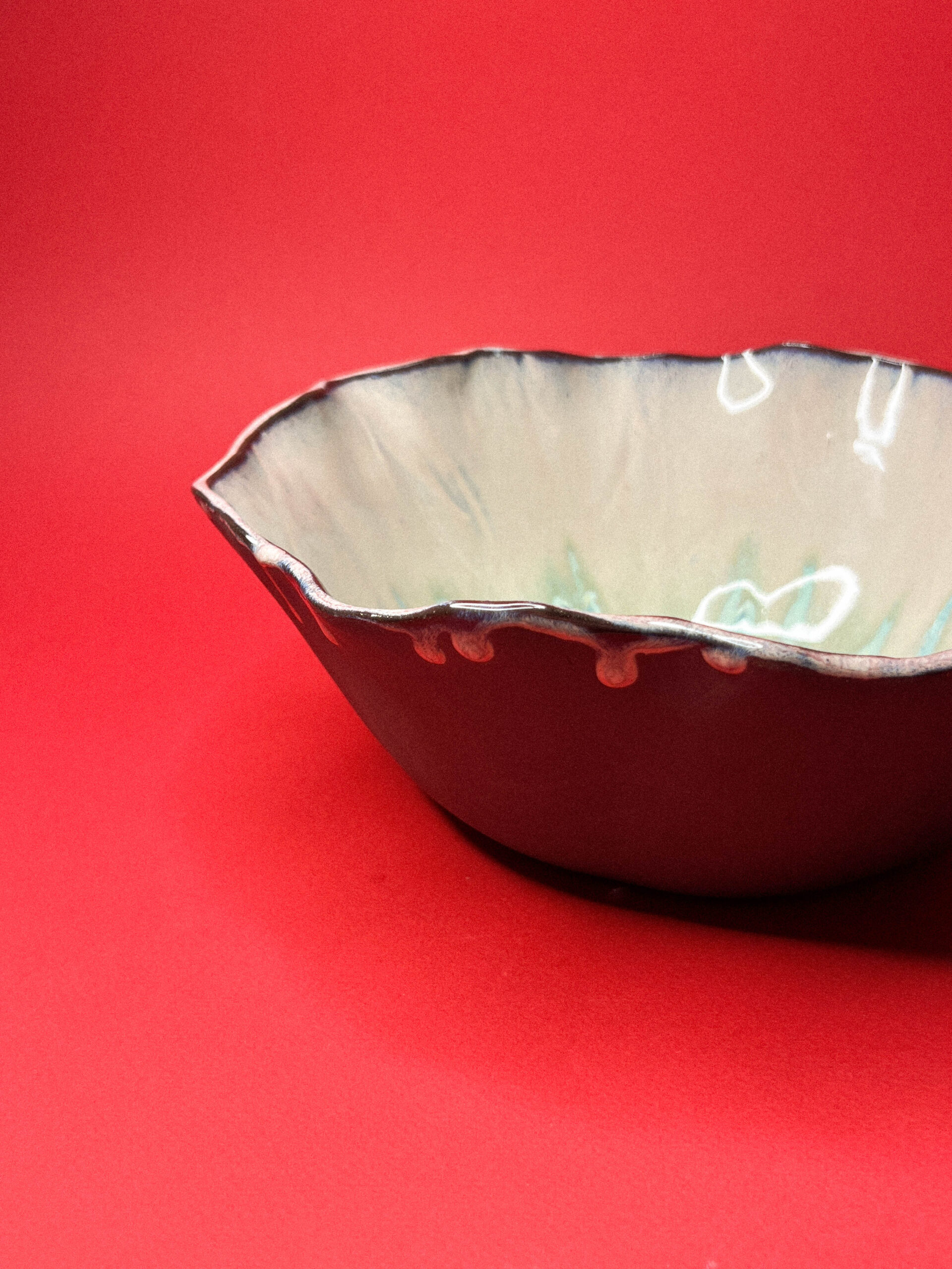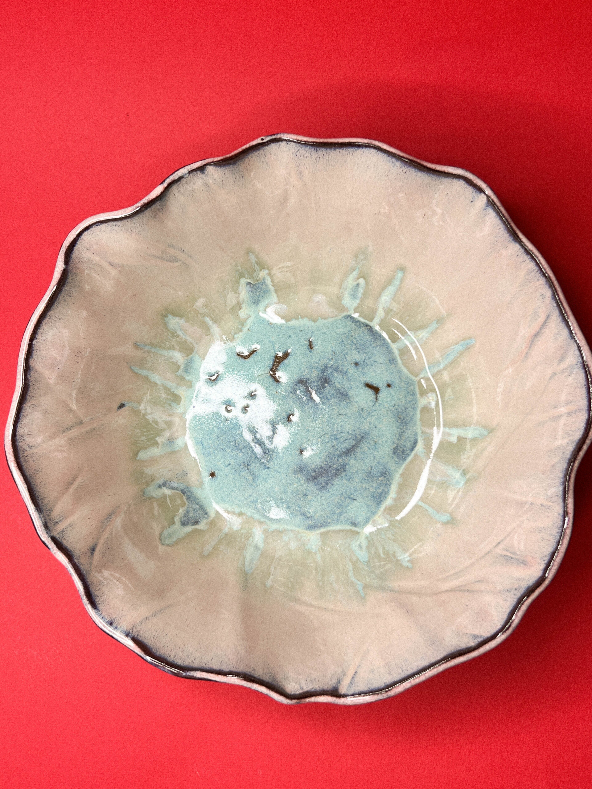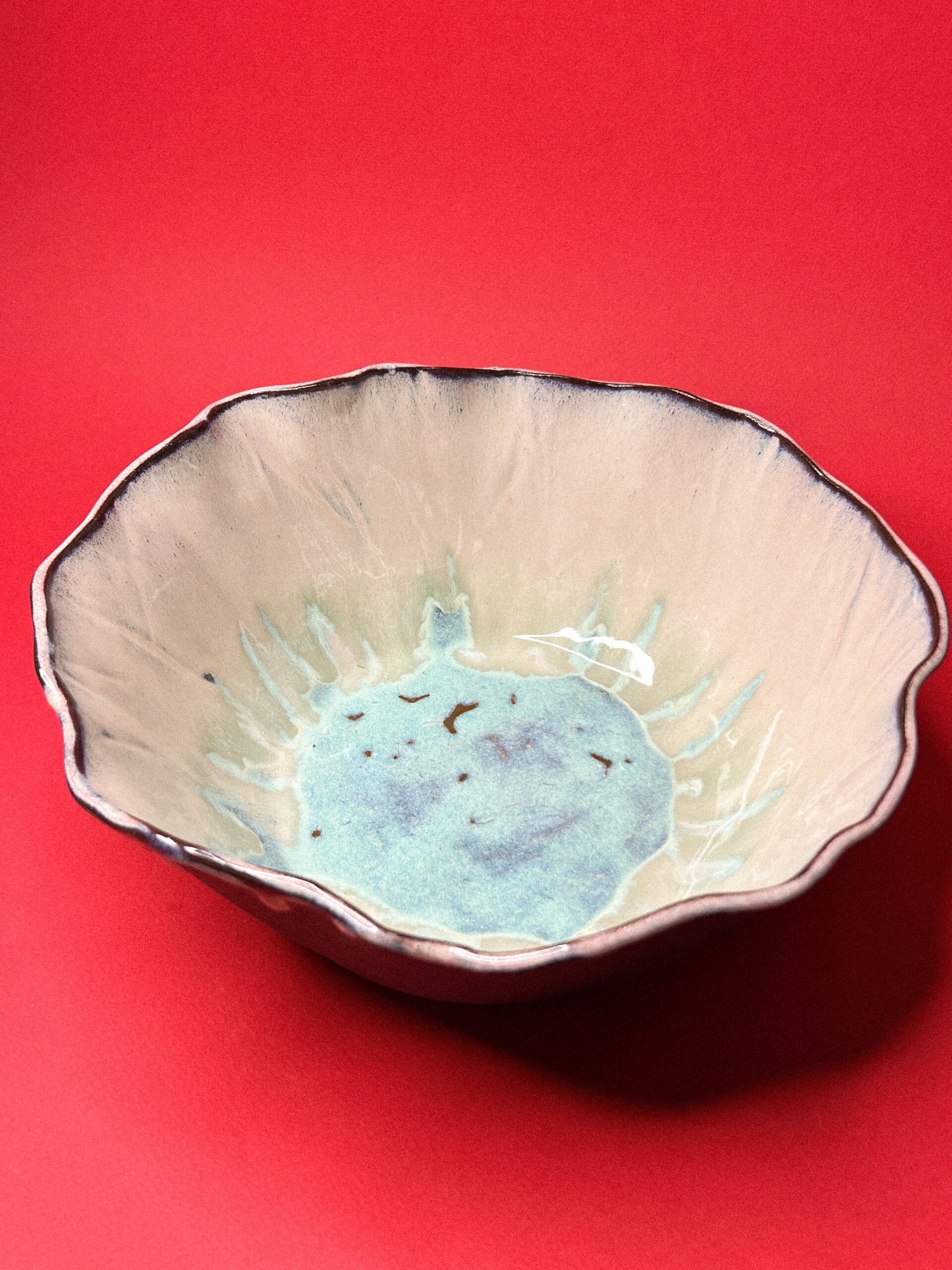 Миска с характером морской стихии — спокойной, глубокой и непредсказуемо красивой. Светлый фон словно песок на берегу, а центр — бирюзовая лагуна с оттенками водорослей, волн и солёного ветра. Глазурь растекается, как прилив, оставляя в каждой капле ощущение прозрачной воды.