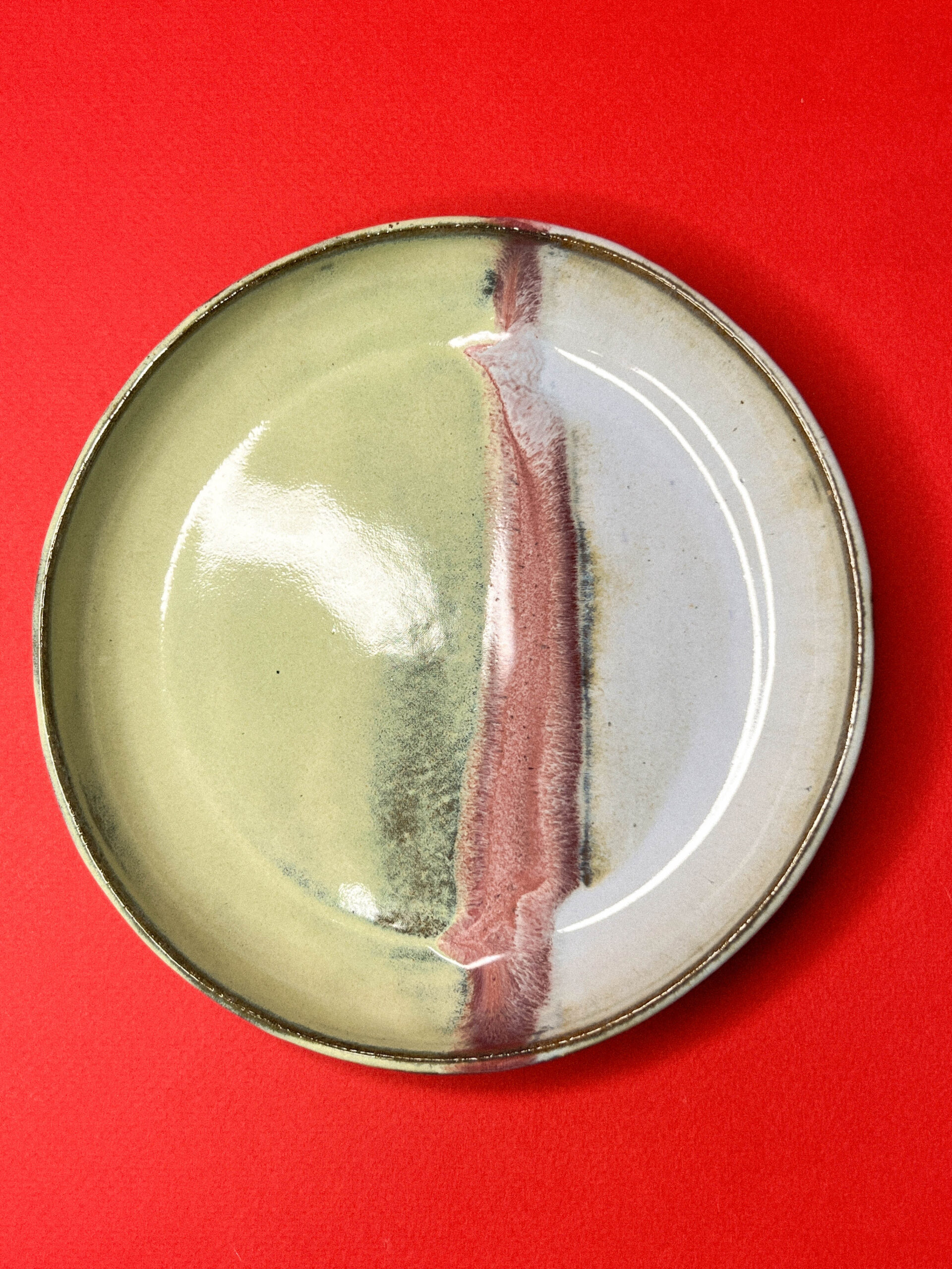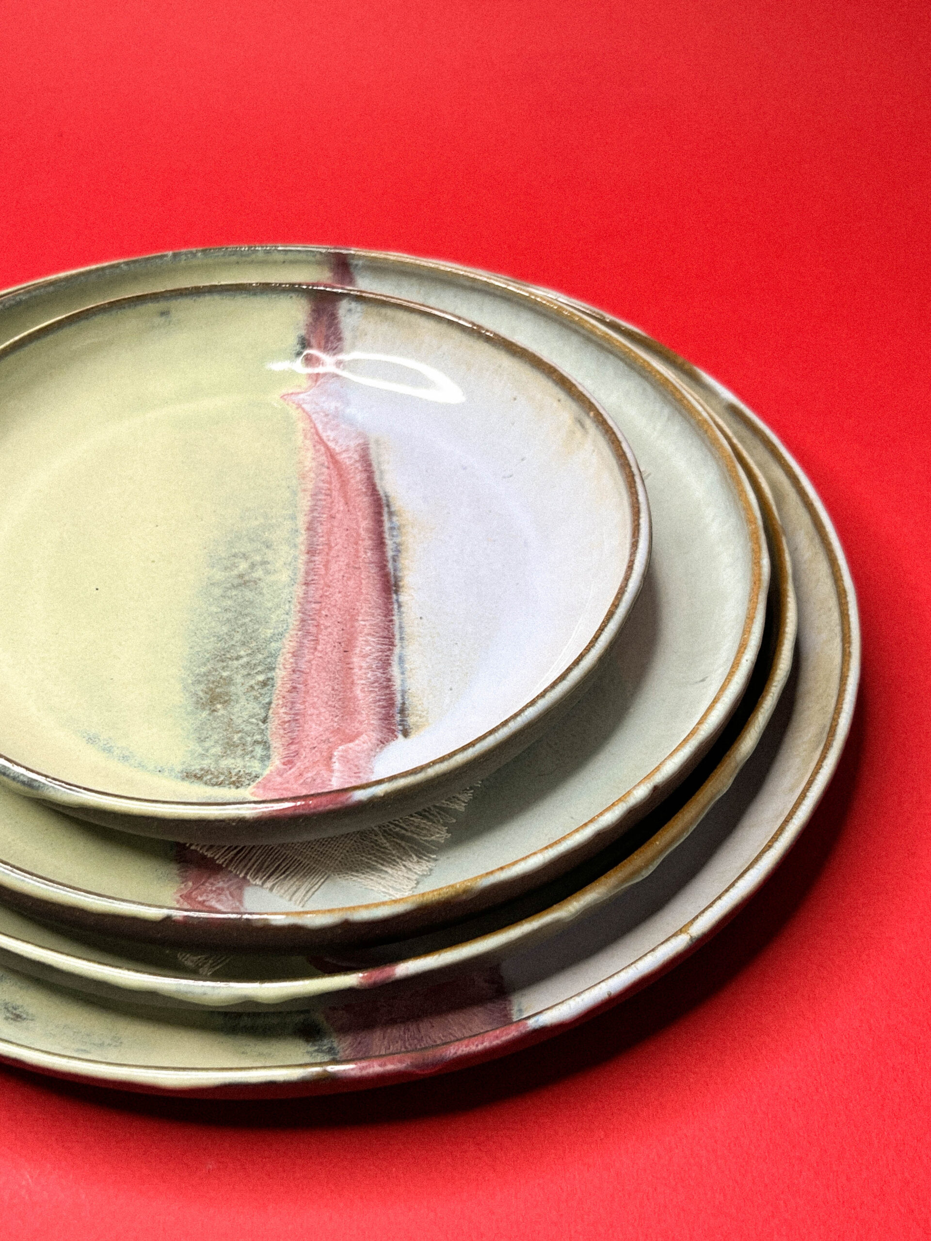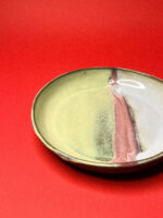 Керамическая тарелка с глазурным потоком, напоминающим береговую линию, где розоватое небо встречается с прохладной дымкой воды.