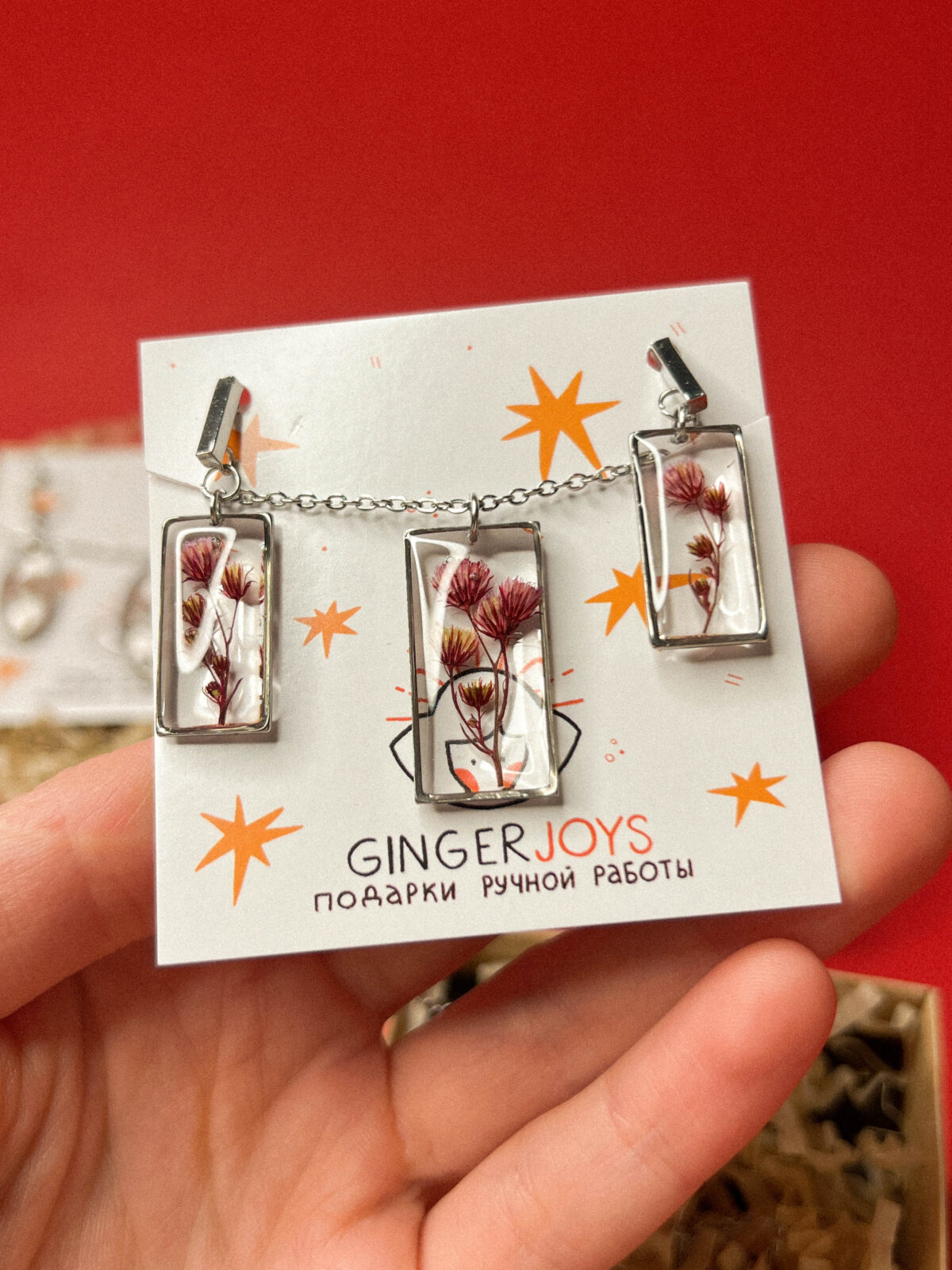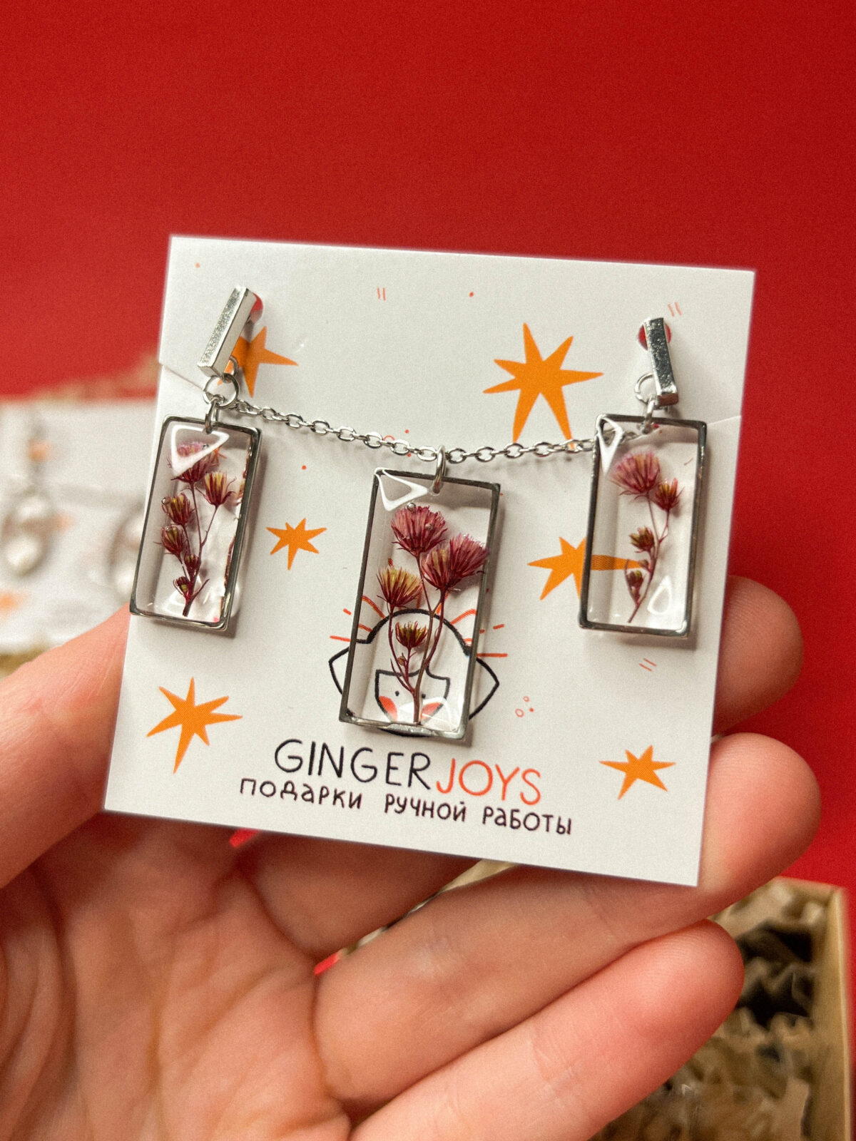 Набор украшений с сухоцветами в ювелирной смоле «Алое сердцебиение» (серьги + кулон), РФ