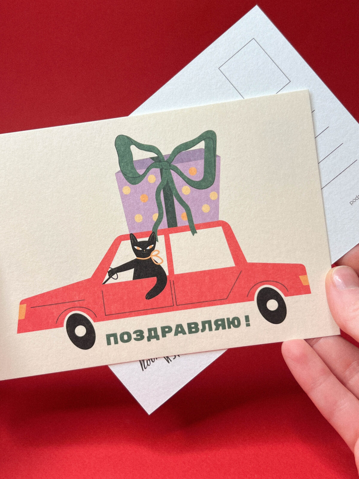 Открытка «Поздравляю! Кот в машине с подарком», 10 × 15 см, РФ