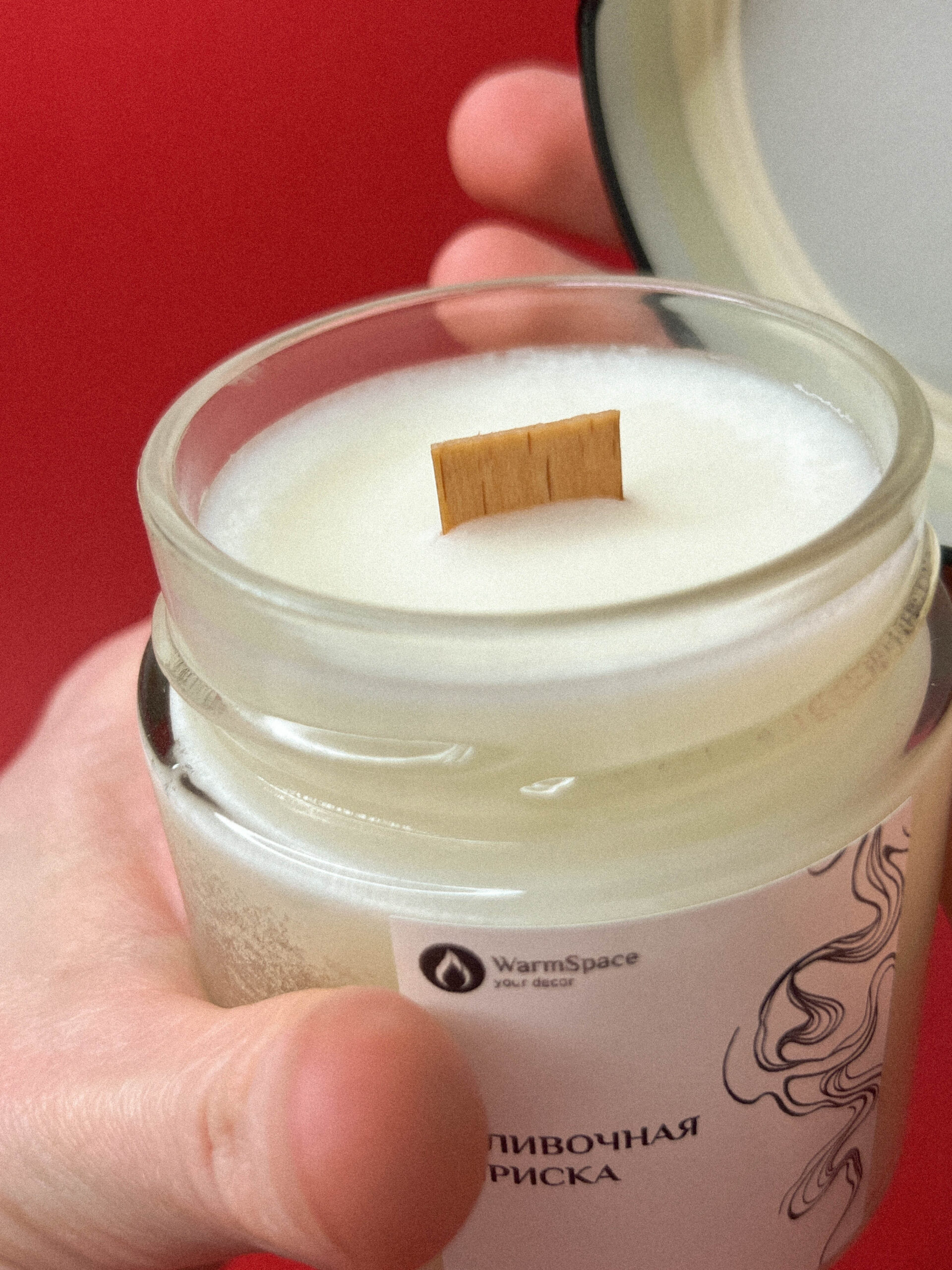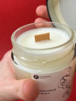 Материал: стеклянная банка с крышкой, 200 гр., деревянный фитиль, ароматические масла. Время непрерывного горения- 16-18 часов.