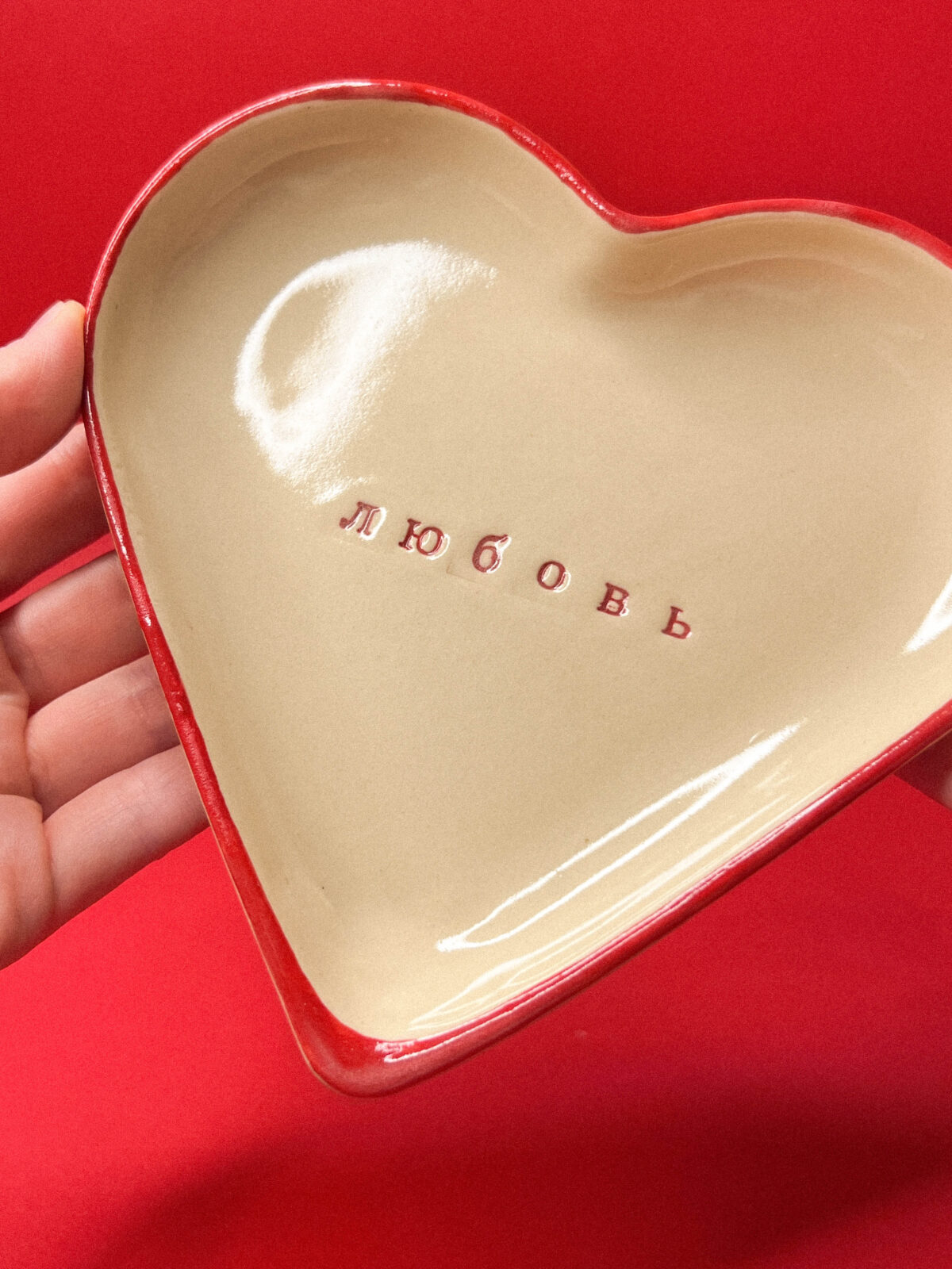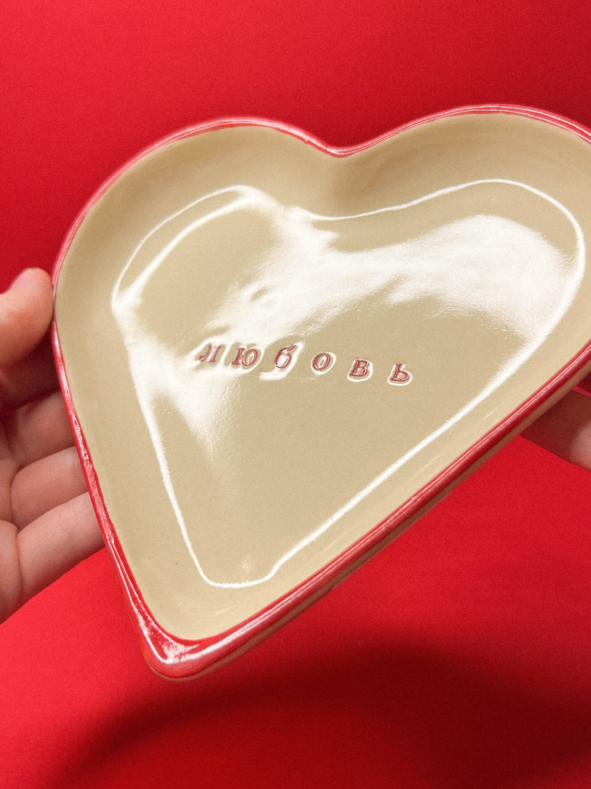 Тарелка в форме сердца с надписью «Любовь», керамика, РФ