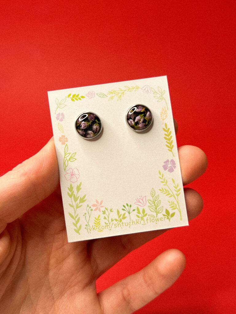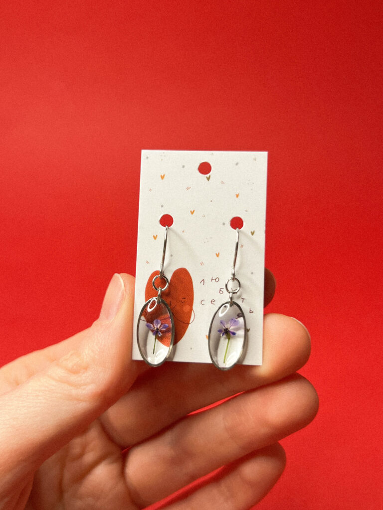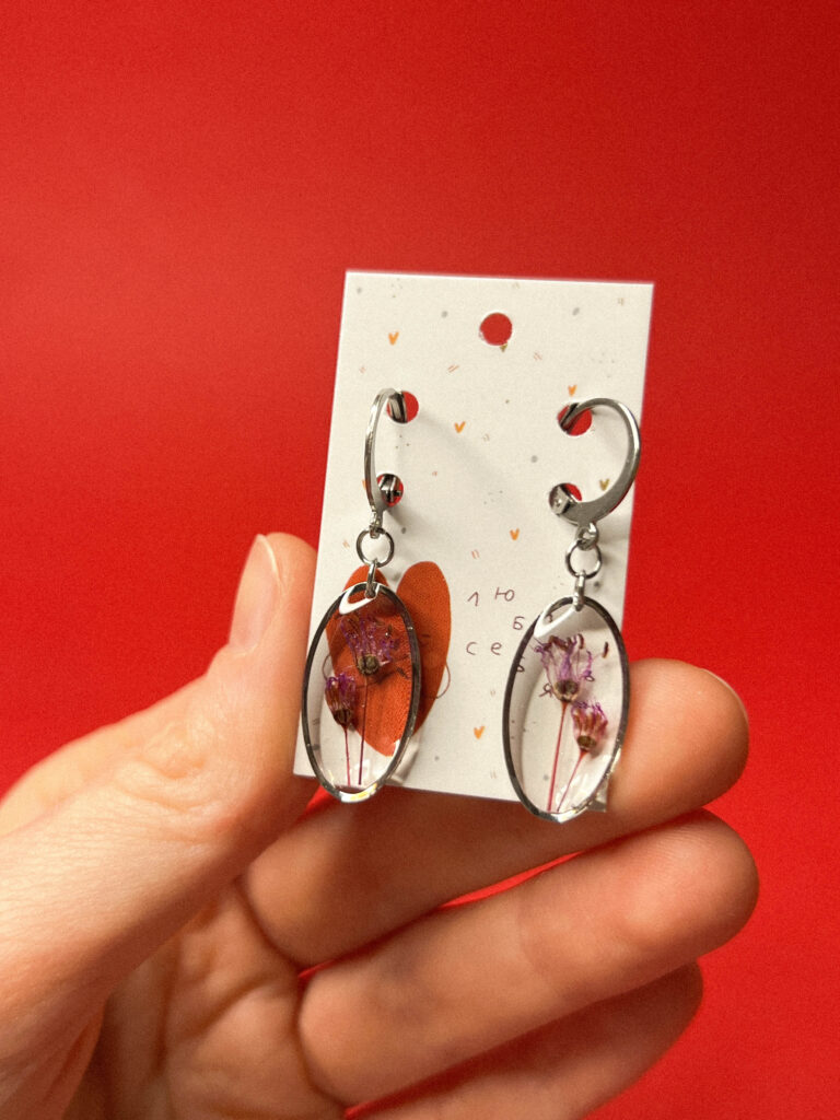 Большие серьги-окошки с сухоцветами в ювелирной смоле «Фиалковая заря», РФ