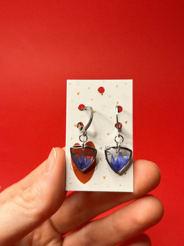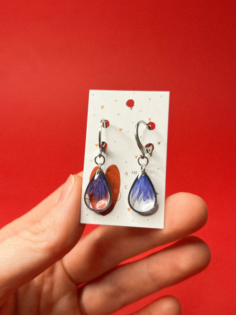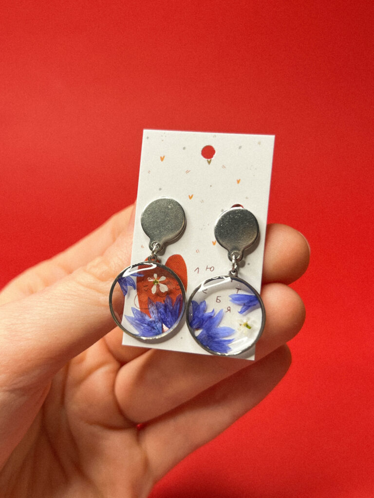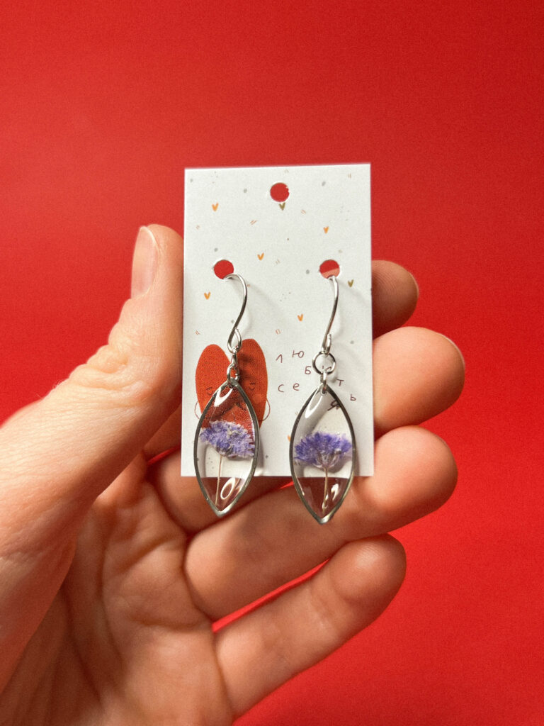 Серьги-окошки с сухоцветами в ювелирной смоле «Сон василька», РФ