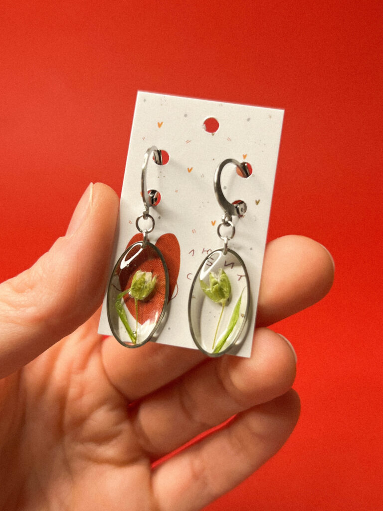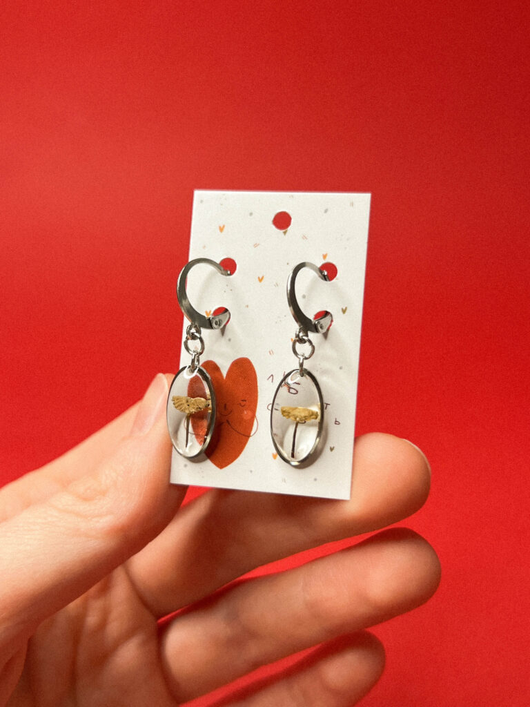 Серьги-гвоздики с сухоцветами в ювелирной смоле «Сердце травинки», РФ